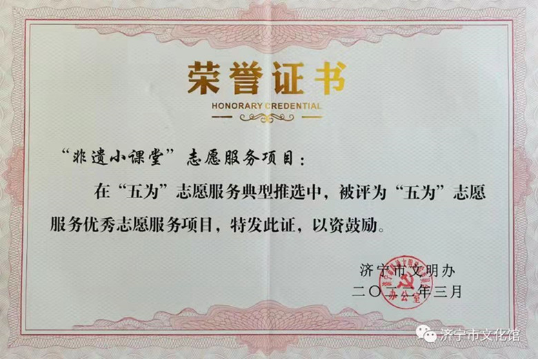 3月5日,在全市深化“五为”文明实践志愿服务活动启动仪式上,济宁市文化馆“非遗小课堂” 被评为“五为”志愿服务优秀项目。