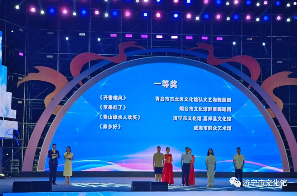 8月11日晚,由山东省文化和旅游厅主办,山东省文化馆、青岛市文化和旅游局承办的“引领新风尚 欢跃新时代”2023年山东省广场舞展演在青岛市城阳区举办,全省16支广场舞团队为现场观众带来了一场精彩的文艺盛宴。经过精彩角逐,济宁市文化馆创作、济宁市文化馆和嘉祥县文化馆共同表演的广场舞《青山绿水人欢笑》荣获一等奖。