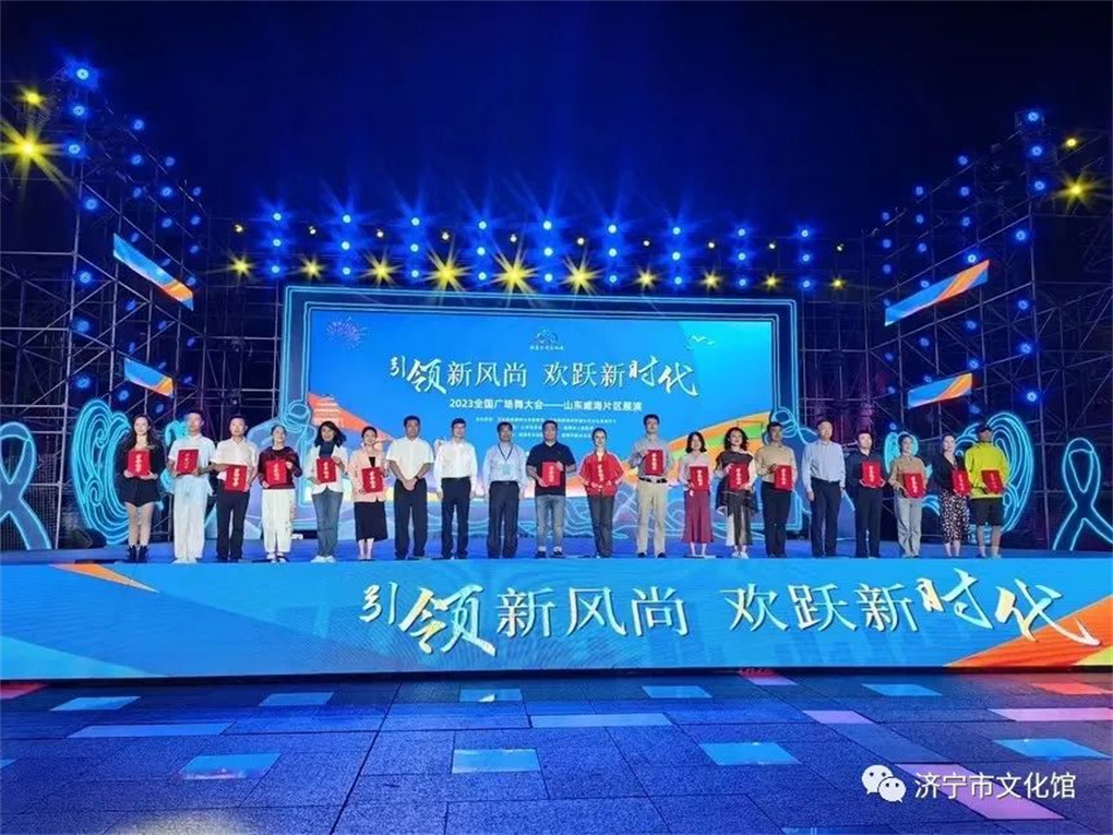 近日,由山东省文化和旅游厅选送,济宁市文化馆、嘉祥县文化馆创作表演的广场舞《青山绿水人欢笑》节目在“引领新风尚 欢跃新时代”2023年全国广场舞展演(山东威海片区)活动中精彩亮相,济宁市文化馆、嘉祥县文化馆群星舞蹈团荣获优秀广场舞团队。