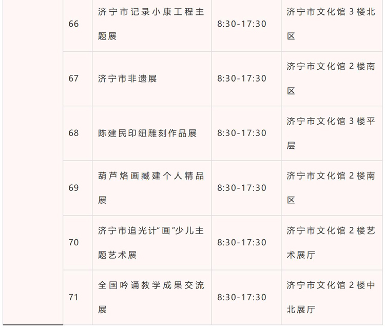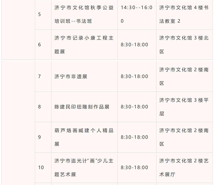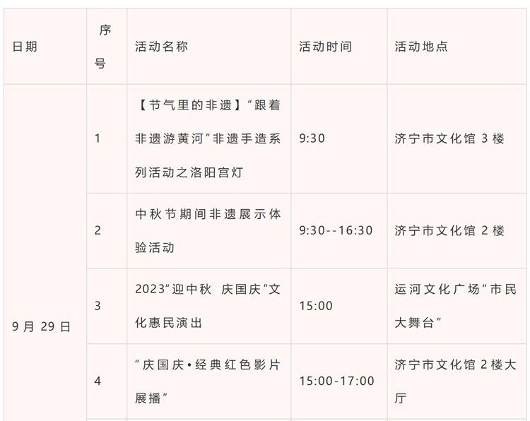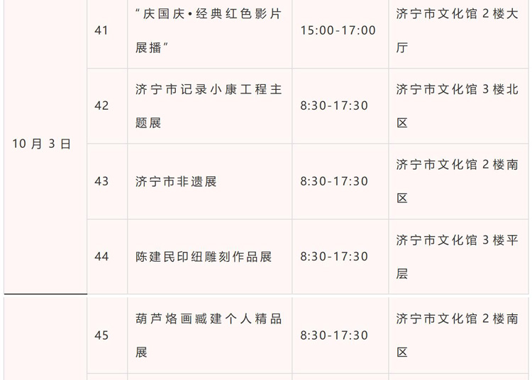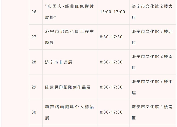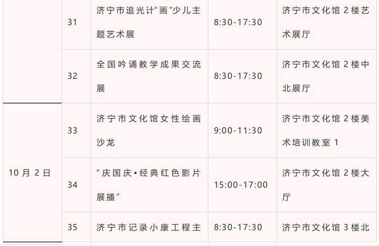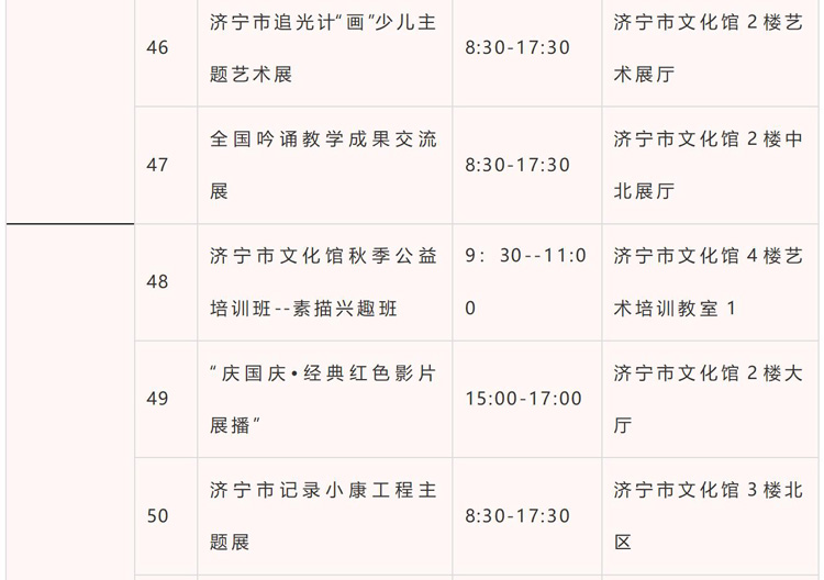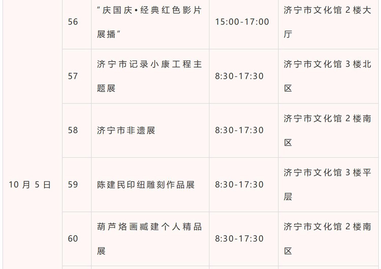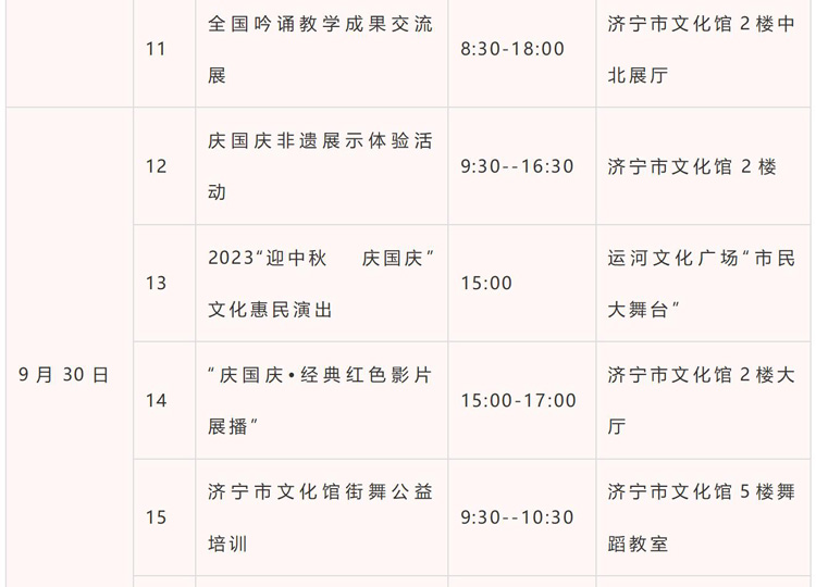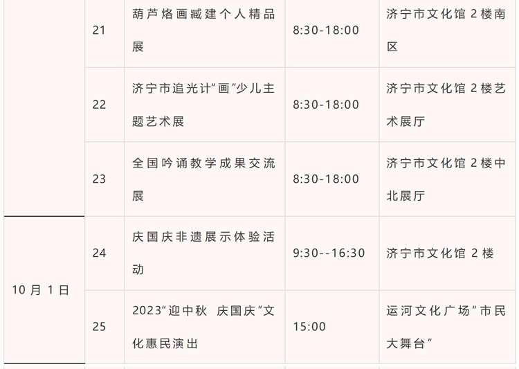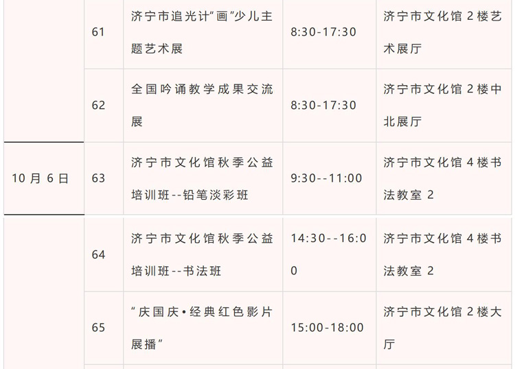 济宁市文化馆微信公众号、文化云平台每天提供迎国庆• 少儿艺术大舞台公益展播、“庆国庆•云上游济宁”济宁风光视频展播、“庆国庆•学才艺”在线艺术培训等精彩线上文化资讯。