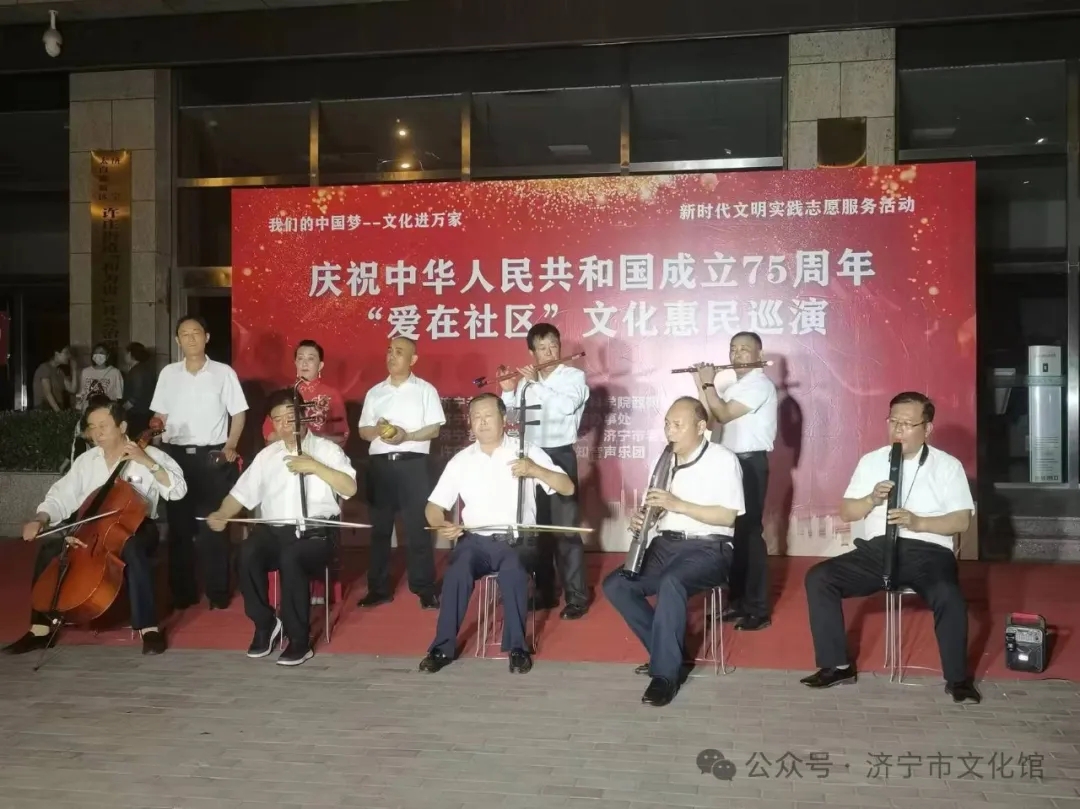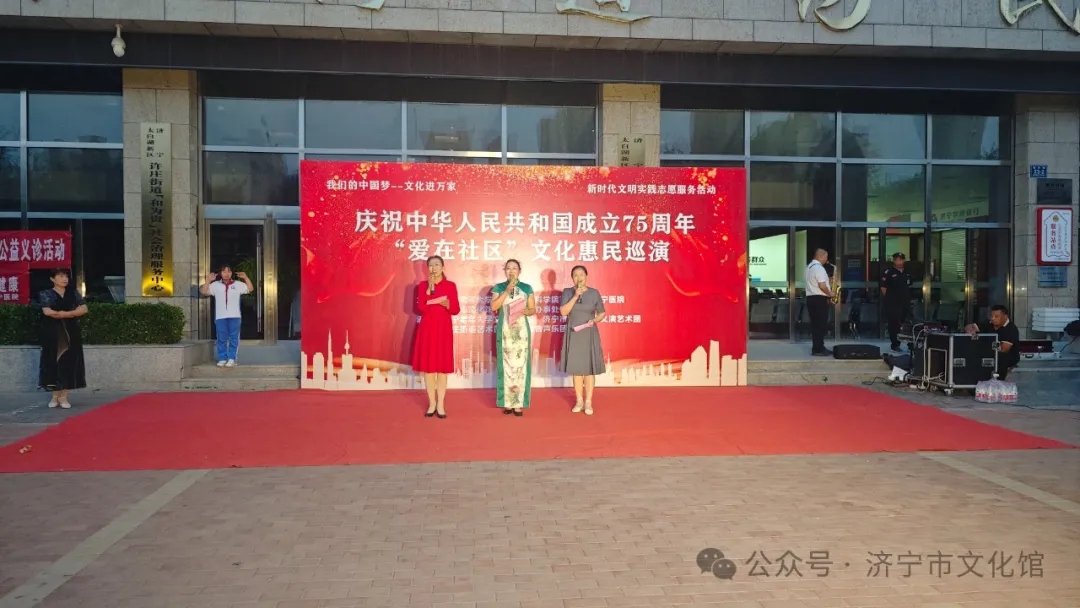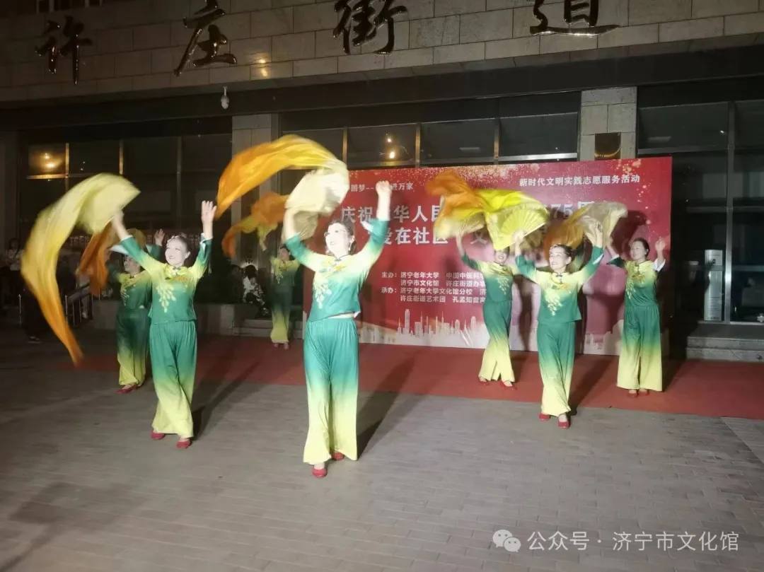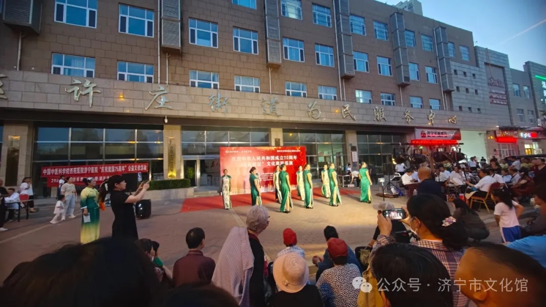 2024年5月17日,为庆祝中华人民共和国成立75周年,丰富驻地居民精神文化生活,提升群众“幸福感 获得感”,由济宁市文化馆、济宁老年大学、许庄街道办事处主办的庆祝中华人民共和国成立75周年文化惠民巡演(第四场),在许庄街道颂运水庭社区成功举办。