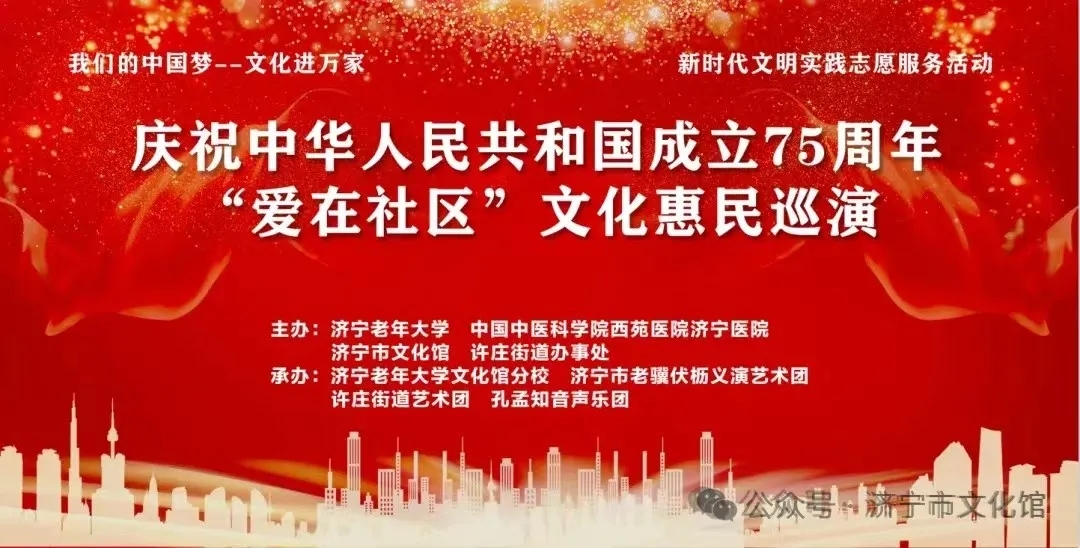 巡演活动,将在许庄街道辖区持续开22场文化惠民演出,演员由济宁市文化馆“市民大舞台”志愿服务队、济宁老年大学文化馆分校学员演出队、许庄街道文艺团队联合组成。丰富多彩的文化演出即将送到您的家门!
