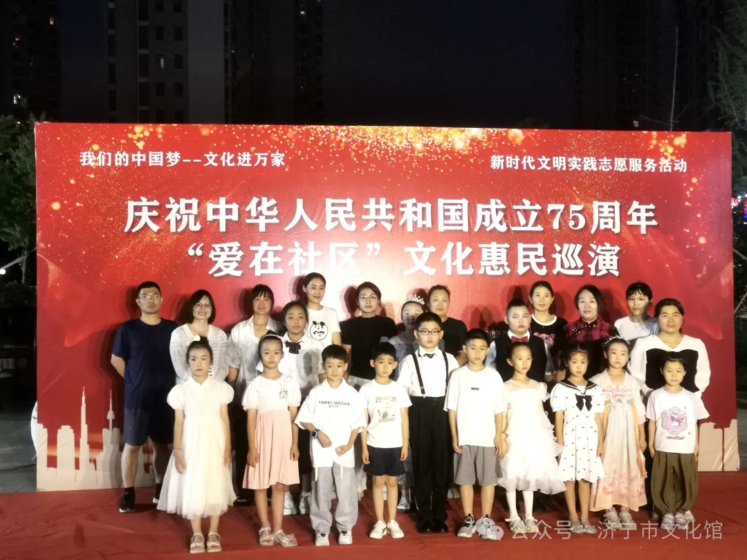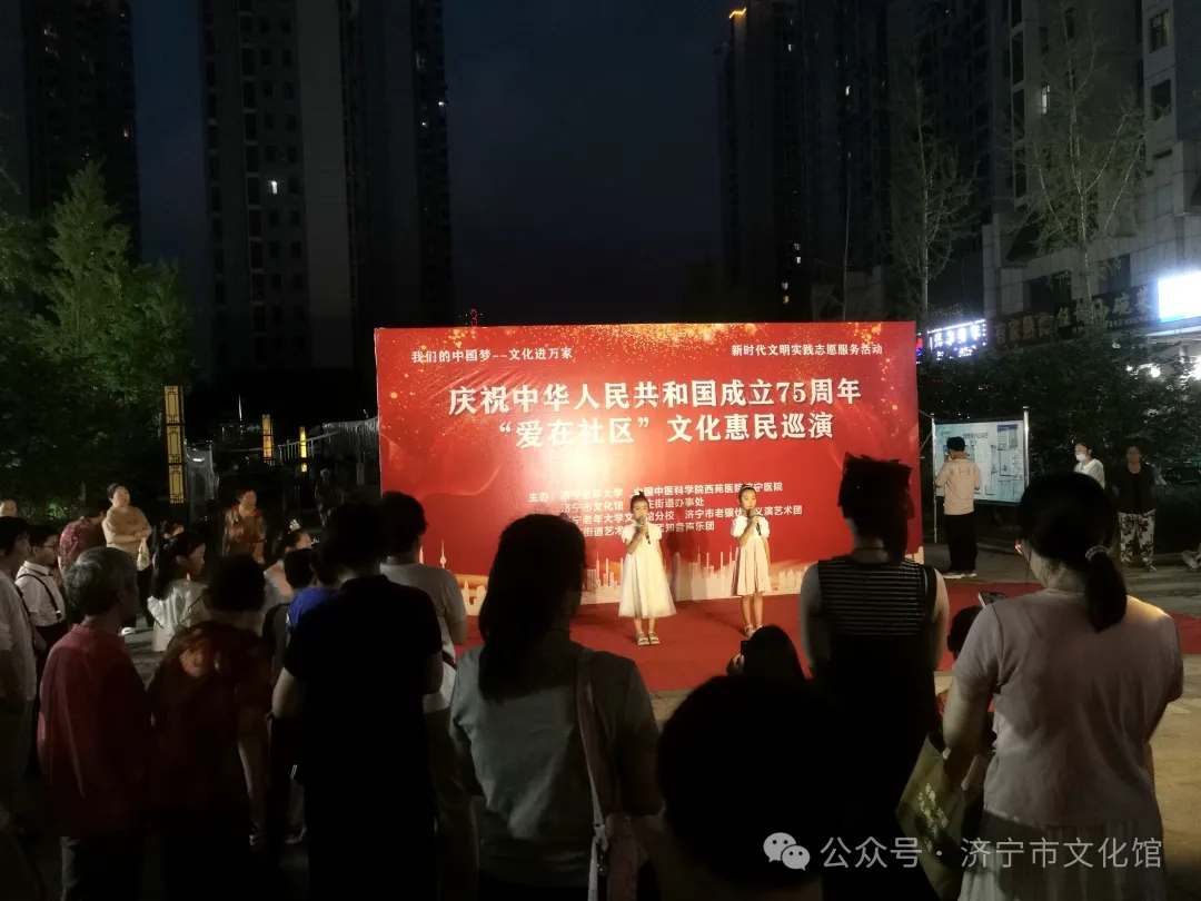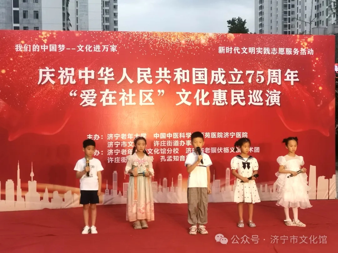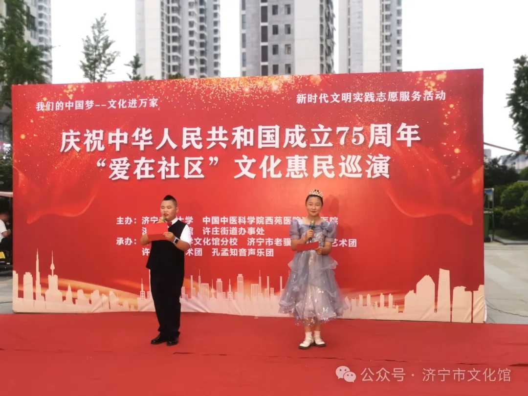 2024年7月20日,为庆祝中华人民共和国成立75周年,丰富驻地居民精神文化生活,由济宁市文化馆、济宁老年大学、许庄街道办事处主办的庆祝中华人民共和国成立75周年(爱在社区巡演第14场),在许庄街道明德花园社区成功举办。