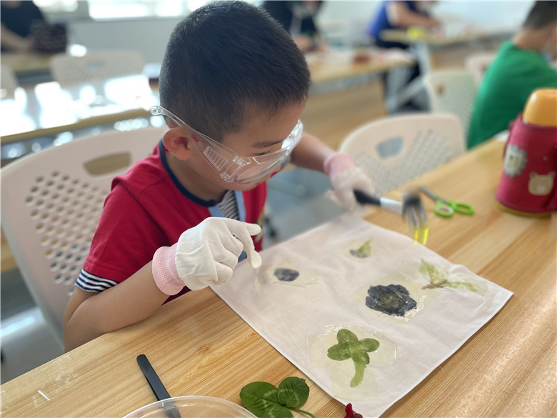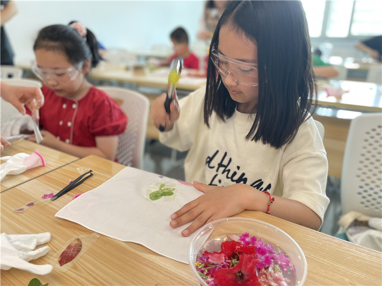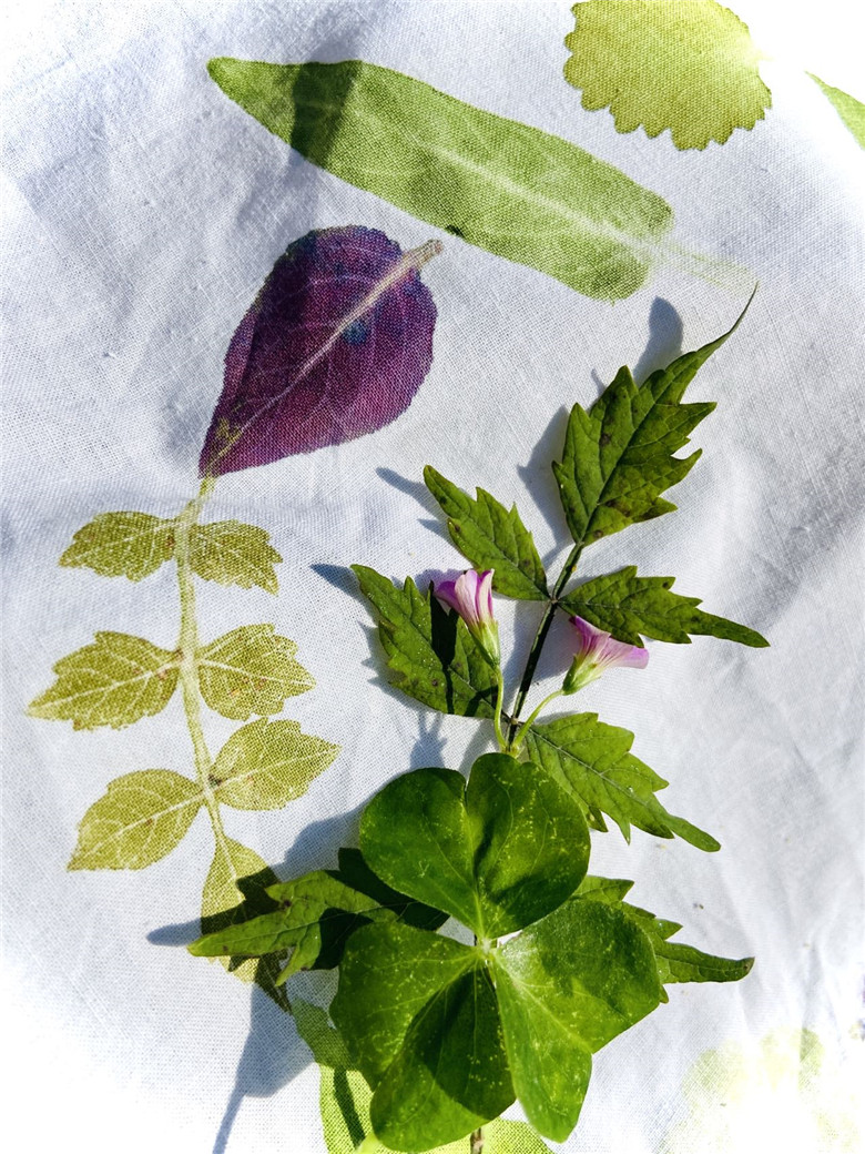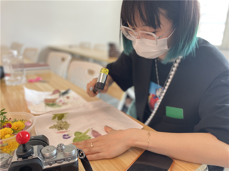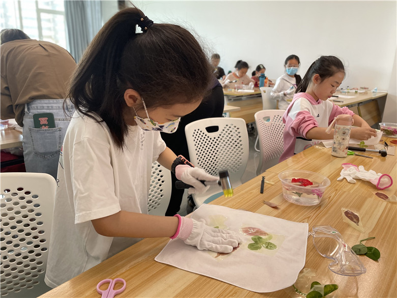定格花草最美的时刻,把这一季的美好保留下来。老师细致的讲解下,大家了解了关于小满的节气知识,又通过采集的叶片认识了多种植物,并通过敲染工艺拓印在手帕上,这让大家体会到自然的魅力与手工的乐趣。