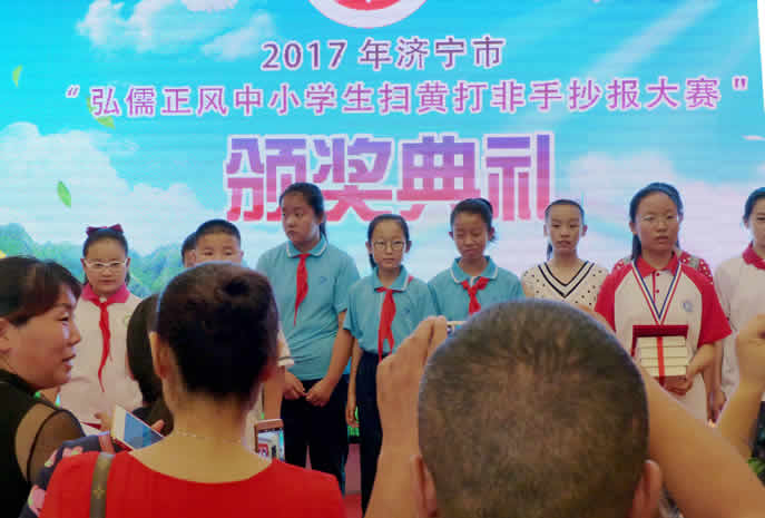 6月18日上午,为弘扬儒家优秀传统文化,打造文明和谐校园,由市委宣传部、市文明办、市”扫黄打非”领导小组办公室主办的全市弘儒正风中小学生”扫黄打非”手抄报大赛获奖作品展暨表彰会在市群众艺术馆举行,共展出中小学生手抄报作品200幅。本次活动历时3个月,全市有10万名中小学生参加,收到作品近5万件,其中60幅作品分获一二三等奖。