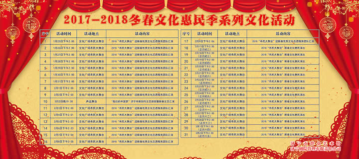 作为今年新春文化惠民系列活动的重头戏之一,2017-2018冬春文化惠民季文化活动将在市民大舞台举办超过30场文艺演出。其中,自25日起至春节前夕共演出16场,春节后则有14场。除了十余个文化志愿团队之外,山东梆子剧院、济宁艺术剧院、济宁杂技团这三大专业院团,也将于春节后在市民大舞台带来精彩的文艺演出。