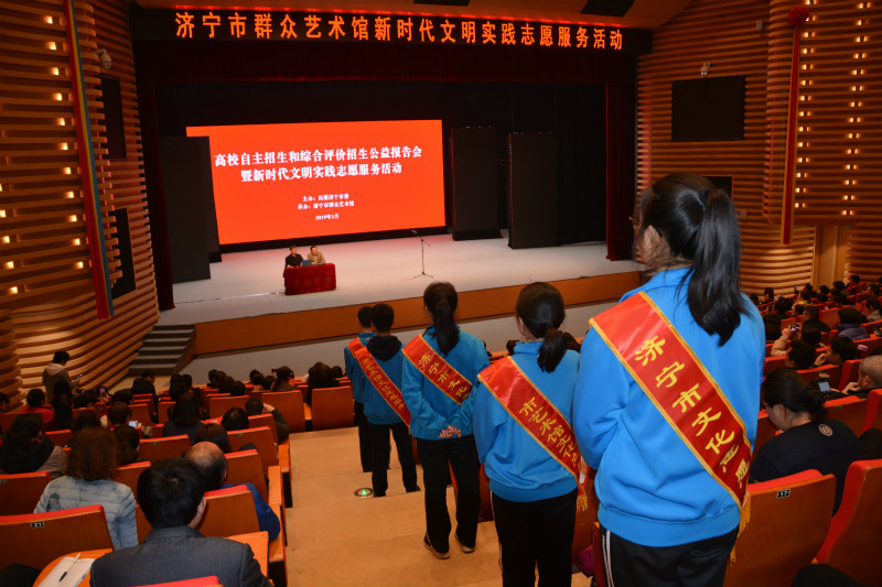 2019年3月9日下午,为让广大考生及家长全面了解高校自主招生和综合评价招生的报名及录取方式,由民盟济宁市委主办济宁市群众艺术馆承办的2019年高校自主招生和综合评价招生公益报告会暨新时代文明实践活动在济宁市群众艺术馆“群星剧场”成功举办。报告会对自主招生和综合评价简介、报考指南、自荐信的写作、考生家长的准备等方面为学生及家长做了详细的讲解。