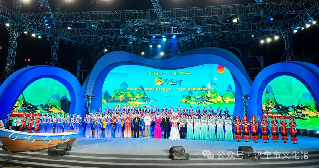潮起运河,相逢盛世。11月30日晚,以“盛世运河”为主题的广西“春雨工程”之“大舞台”暨2024年南宁市“绿城歌台”群众文化活动--“冬之梦”大型音诗画情景专场演出在民歌湖大舞台绚丽上演。济宁市文化馆携手南宁市文艺志愿者和来自大运河沿线杭州、天津,灵渠所在地兴安,平陆运河沿线横州、钦州等城市的文艺志愿表演团体,以丰富多彩的艺术形式联合展现运河文化的深厚底蕴与新时代风采。