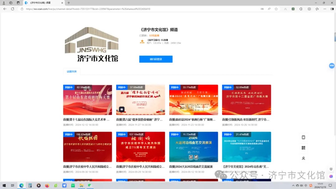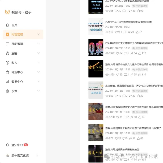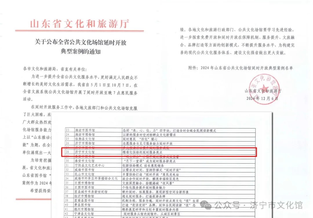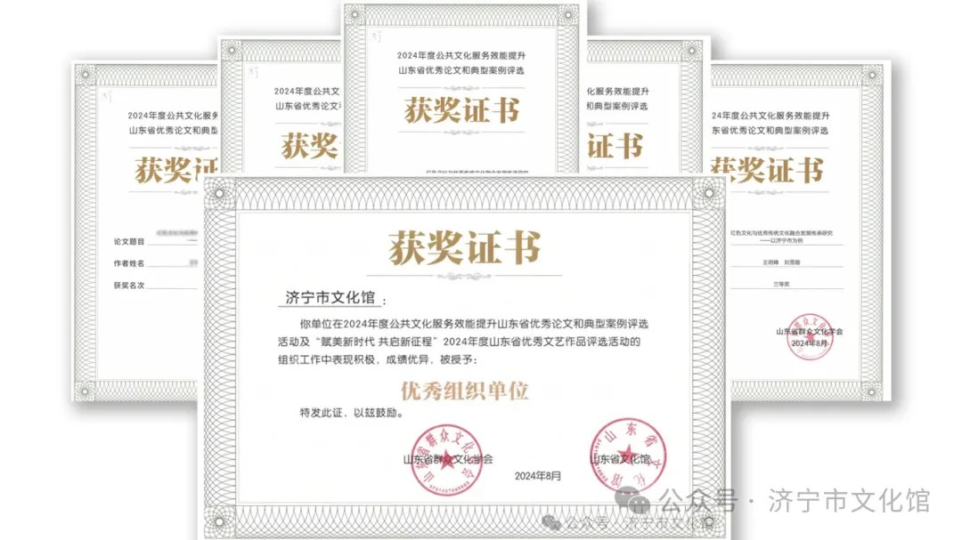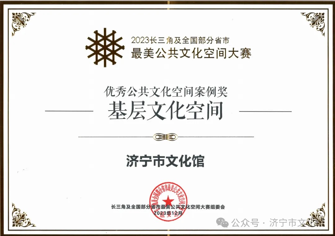 2024年,济宁市文化馆在社会各界的大力支持下,圆满完成全年工作,馆内共接待群众30.32万人次,馆外服务群众约35万人次,线上服务群众2574.1万人次。获长三角及全国部分省市“最美公共文化空间大赛优秀公共文化空间案例奖”,获全省公共文化场馆延时开放典型案例。