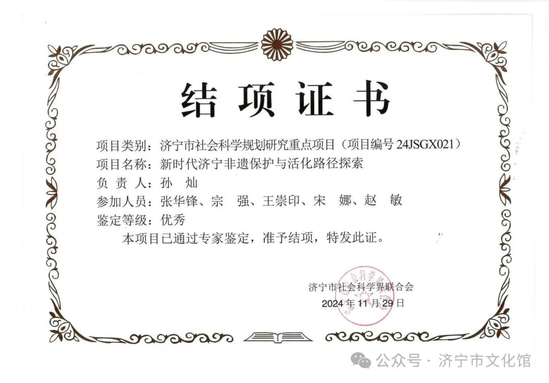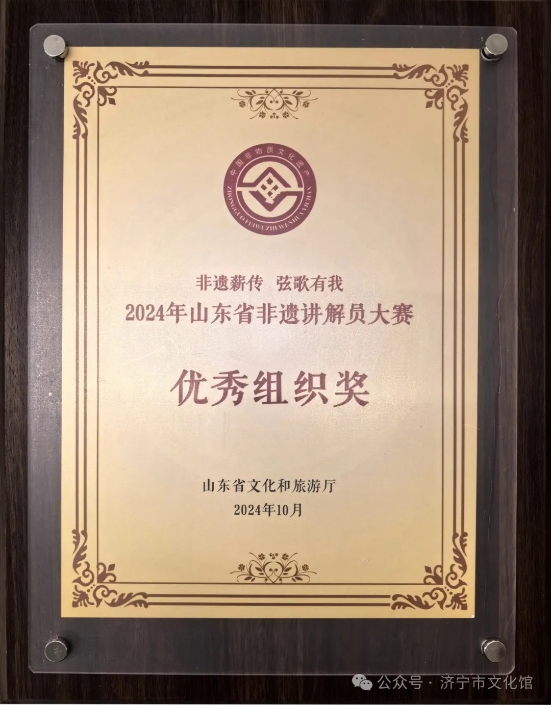 成功举办了15场非遗展演活动,开展“非遗小课堂”志愿服务项目96次。创新打造了“匠心遗韵•非遗研学行”活动。16个项目入选第六批省级非遗项目名录。三项工作荣获济宁市非遗保护亮点工作;1个项目入选国家级非遗生产性保护示范基地;五个案例入选山东省非遗工作典型案例。获全省非遗进校园优秀实践案例。组织项目参加第八届中国非遗博览会。