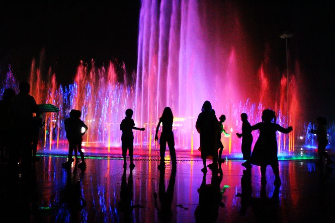 远远地就看到彩色喷泉一片片一阵阵的跳跃、舞蹈,音乐飞扬,到跟前,喷泉更是雄大、美观,一圈圈的彩色水帘次第跃起,红、蓝、紫、黄、绿、粉色应有尽有,水柱冲天而起,高可达五六层楼高,人们围成一大圈喝彩,随着喷泉的迭起而惊呼、开怀,有的都跑到喷泉中央去,身在其中亲密感受喷泉带来的沁凉和惊喜。人们也似乎是彩色的了。水帘随着音乐声不断地变化,千姿百态,万紫千红,孩子们呼喊,故意去喷口伸腿淋水,有的则打着伞,看样子,他们是有备而来啊。忽然不喷了,灯光也没了,人们的圆圈缩小了,都跑到喷泉上去了,正在大家不经意间,忽然,一股大水又冲天喷涌而出,人们惊呼、跳跃,但是一点也不埋怨,再欢喜地欣赏又一次彩色的盛宴。有一个母亲还推着轮椅上的9岁小女儿也来看喷泉,女孩从头部以下都不能动,妈妈把她推到彩色喷泉紧跟前,穿着白色花裙子的女孩脸上露出了红彤彤的灿烂笑容。