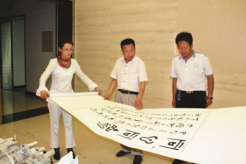 此次活动的圆满成功源于任城区统战部联合区文化馆做了大量细致仔细的前期工作,使本次展览达到一个较高的水平。图为任城区文化馆馆长苏丽萍女士与统战部领导一起挑选参展作品。