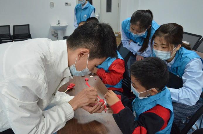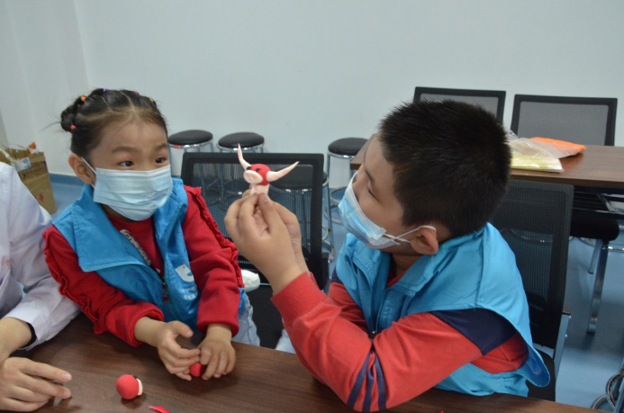 随后,孩子们开展非遗体验,听非遗传承人细心讲解、展示栩栩如生的面塑作品,并手把手教学,让孩子们亲身体会制作面塑作品。走近非遗、走近艺术对于孤独症儿童来说,是最独特的社会融合体验,不仅能让孩子们开阔视野,促进同伴间的社会性交流,享受集体游戏的快乐;更能帮助孩子们在集体环境中提高规则意识、专注力和伙伴合作意识,增强手部精细锻炼。