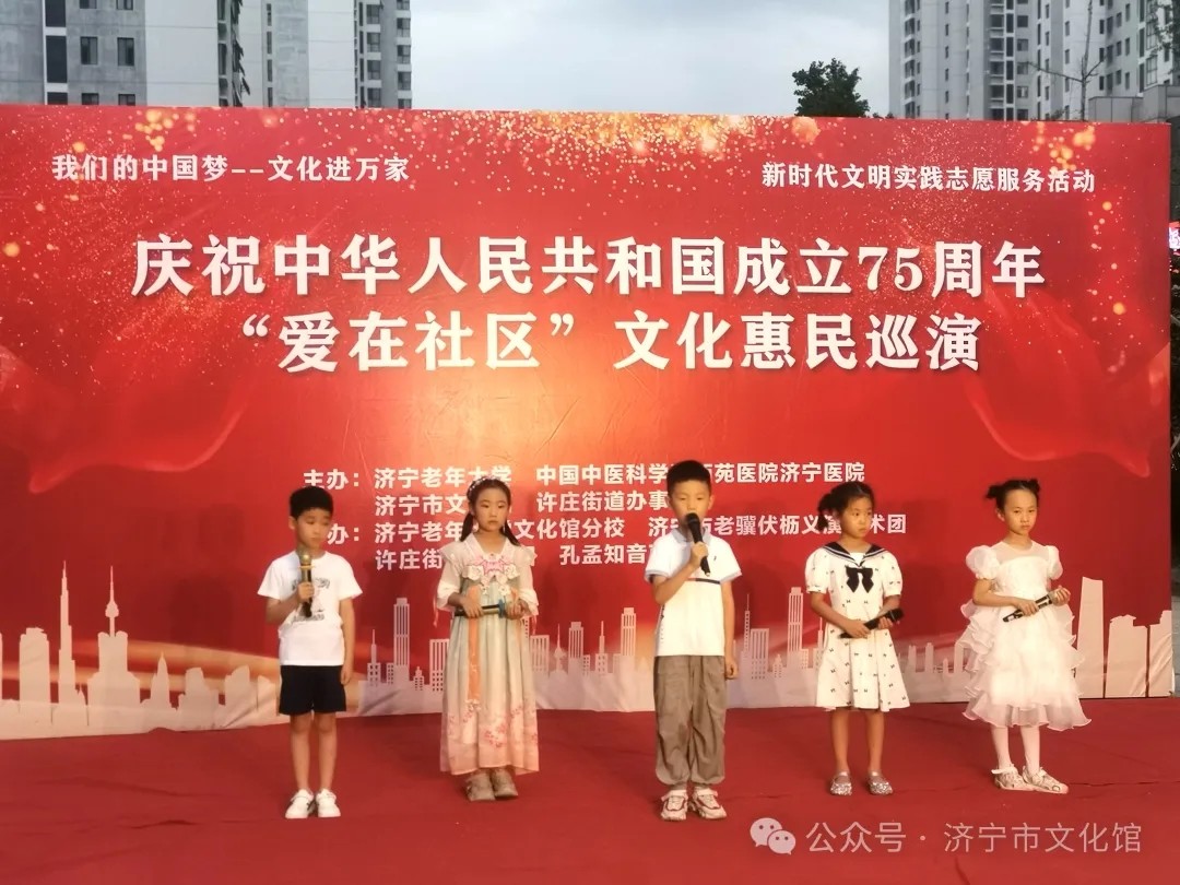 2024年7月20日,为庆祝中华人民共和国成立75周年,丰富驻地居民精神文化生活,由济宁市文化馆、济宁老年大学、许庄街道办事处主办的庆祝中华人民共和国成立75周年,在许庄街道明德花园社区成功举办。