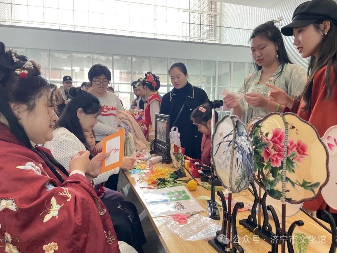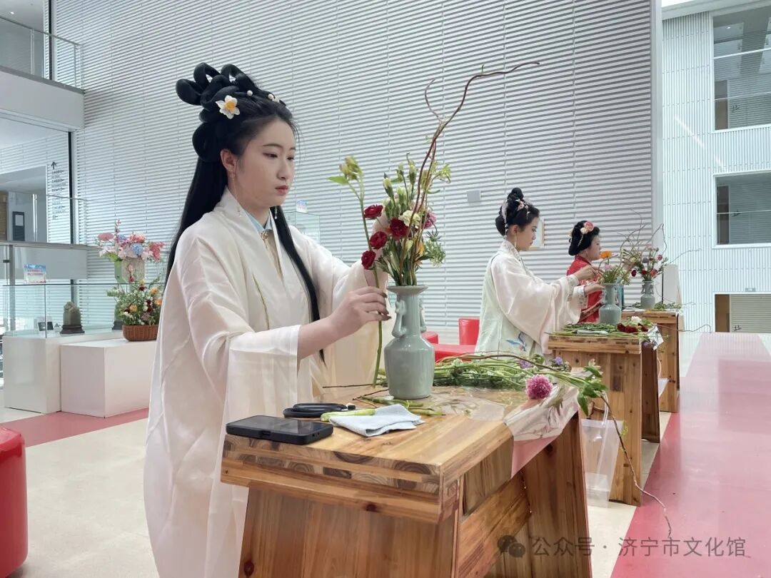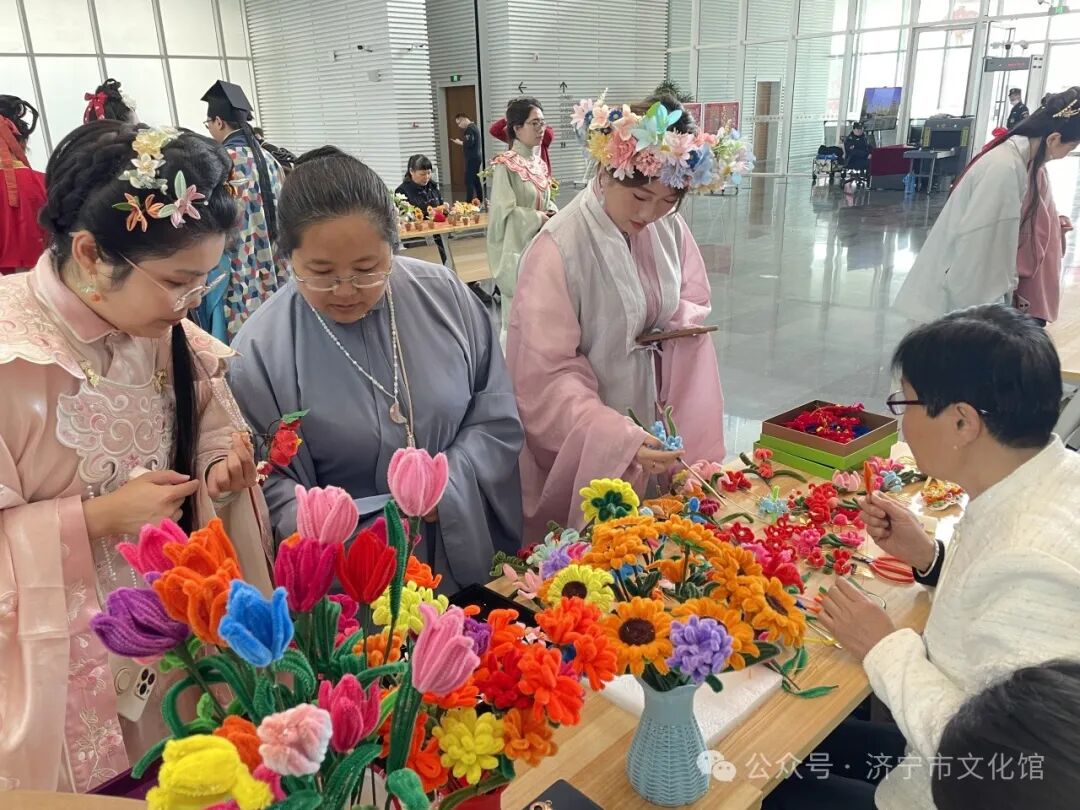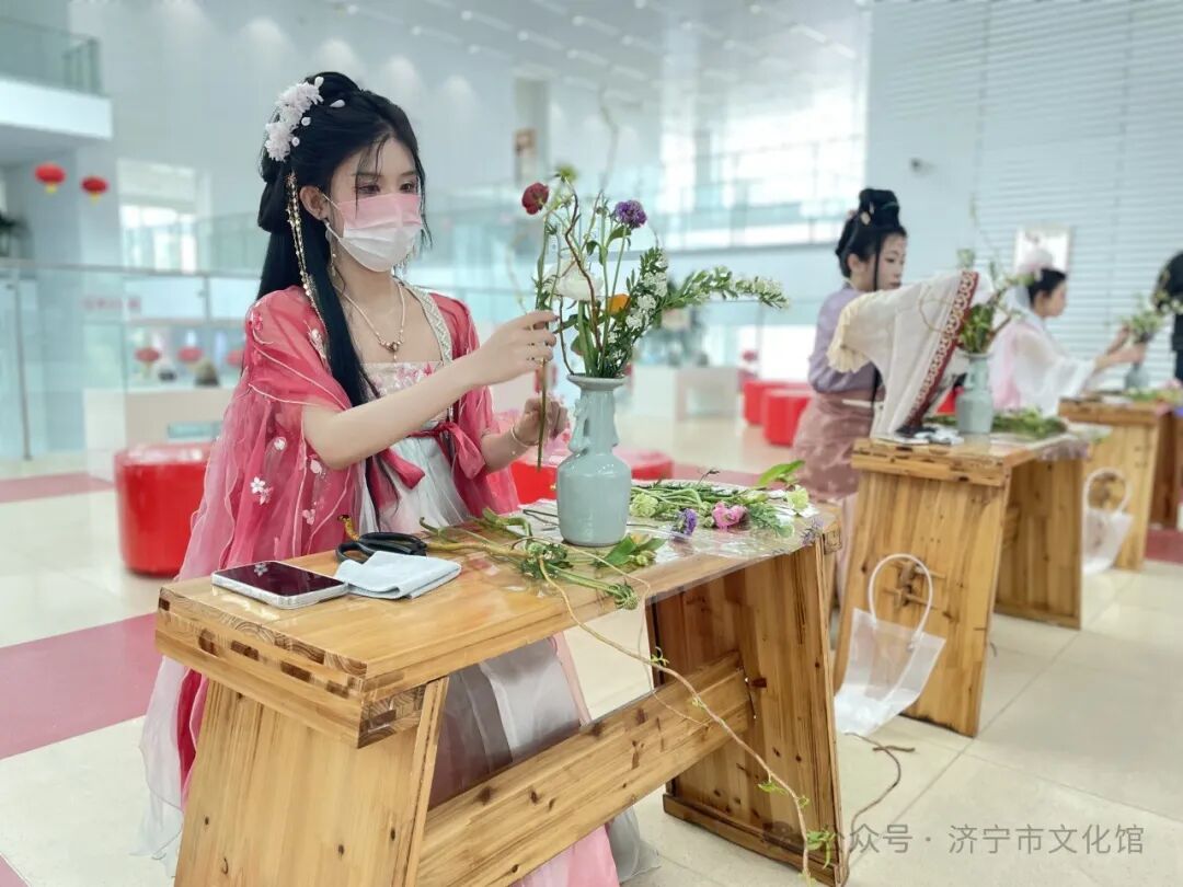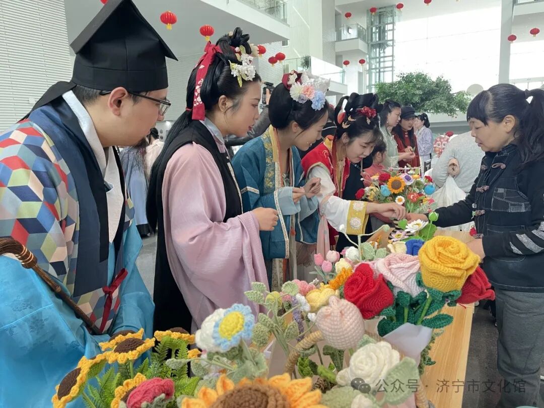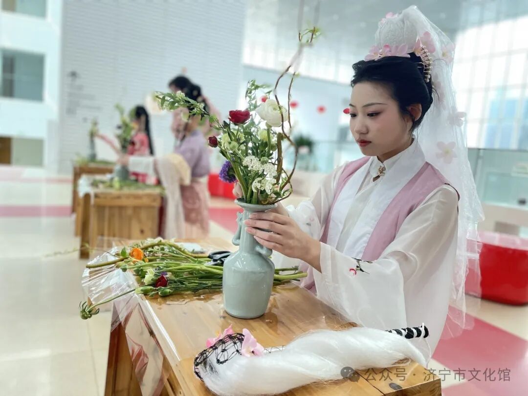 春事繁盛,以花留春 看繁花绚烂,系红帛祈愿 着华丽汉服,体验传统民俗, 非遗绒花、插花,锁住各式春色 来吧,让我们一起来到文化馆, 看看属于中国人的浪漫, 感受中国传统花朝节的文化之美! 此次活动是济宁市文化馆“节日里的非遗”系列活动之一。本次活动以展示汉服文化为核心,融合刺绣、绒花、针钩编织、石头画等非遗元素,设置中国传统插花非遗精品课程,开展各类民俗小游戏,打造出古典、雅致的活动空间,营造出和谐风趣氛围,活动内容丰富、形式多样。 活动于上午10点开始,汉服爱好者们身着汉服陆续入场,他们舞衣翩跹,行若扶柳,气质超然,或端庄娴雅,或典雅高贵,或小家碧玉,生动展示汉服的独特魅力。 活动现场非遗小集市吸引了不少“花神”以及“护花使者”,刺绣、绒花、针钩编织、石头画展位前,繁花在传承人手中朵朵绽放,他们用各自的绝活定格这盎然的春色。 雅致的几案前,大家悉心静坐,插花赏花,听老师娓娓道来,讲述中国传统插花的由来,感受花的自然美,体验新中式里的国潮风,享受暖春里的漫时光。 除此之外还设置了投壶、飞花令、丢沙包等民俗小游戏,大家欢乐的沉浸其中。 此次活动多维度展示了汉服文化的艺术魅力、创新推进了非遗的传承与保护,进一步激发民族自豪感和文化自信。