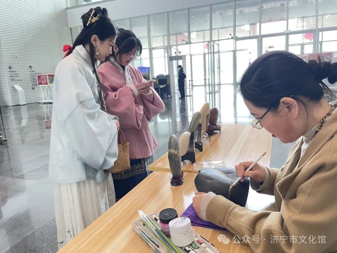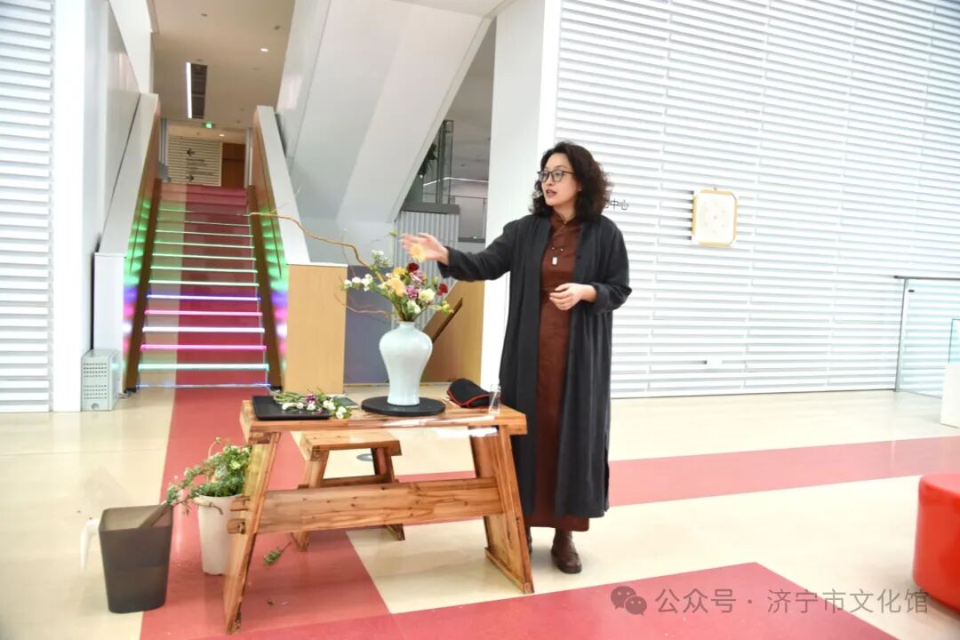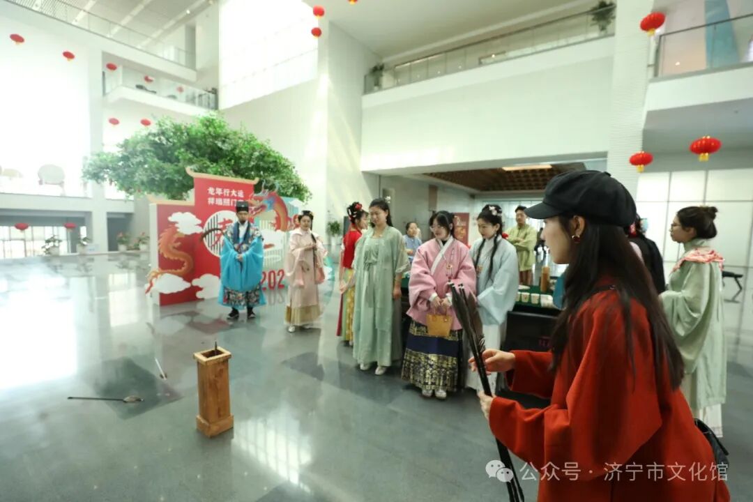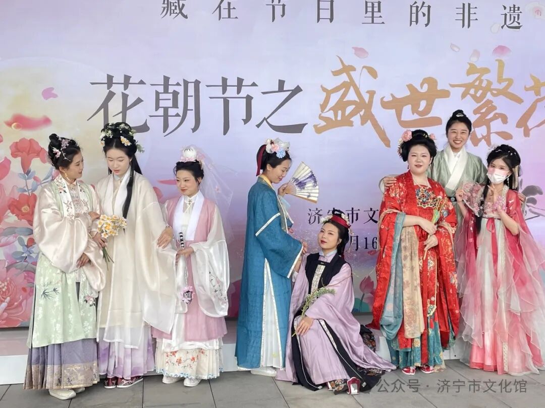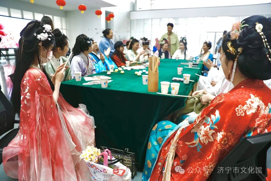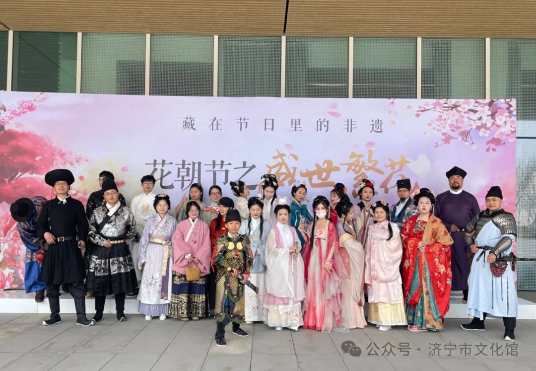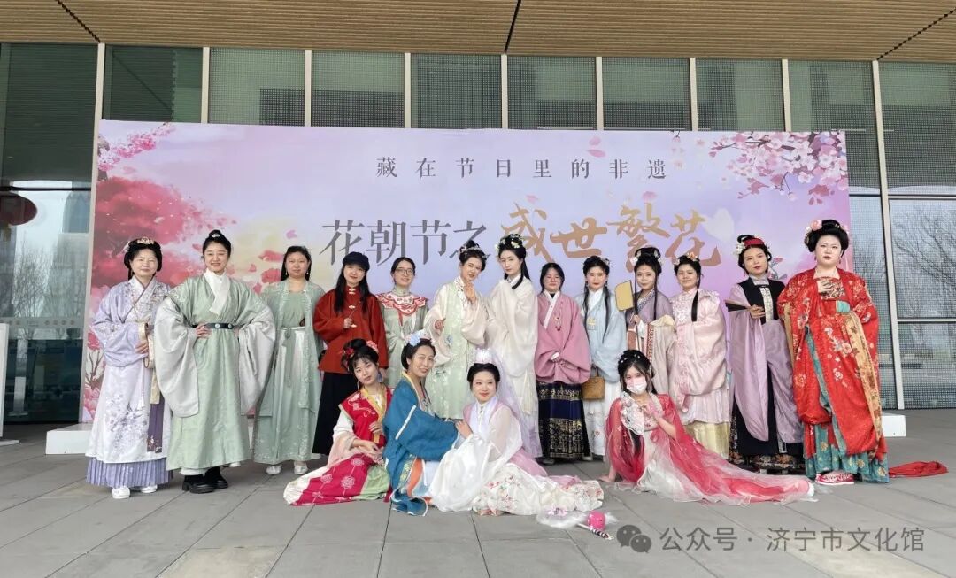 春事繁盛,以花留春 看繁花绚烂,系红帛祈愿 着华丽汉服,体验传统民俗, 非遗绒花、插花,锁住各式春色 来吧,让我们一起来到文化馆, 看看属于中国人的浪漫, 感受中国传统花朝节的文化之美! 此次活动是济宁市文化馆“节日里的非遗”系列活动之一。本次活动以展示汉服文化为核心,融合刺绣、绒花、针钩编织、石头画等非遗元素,设置中国传统插花非遗精品课程,开展各类民俗小游戏,打造出古典、雅致的活动空间,营造出和谐风趣氛围,活动内容丰富、形式多样。 活动于上午10点开始,汉服爱好者们身着汉服陆续入场,他们舞衣翩跹,行若扶柳,气质超然,或端庄娴雅,或典雅高贵,或小家碧玉,生动展示汉服的独特魅力。 活动现场非遗小集市吸引了不少“花神”以及“护花使者”,刺绣、绒花、针钩编织、石头画展位前,繁花在传承人手中朵朵绽放,他们用各自的绝活定格这盎然的春色。 雅致的几案前,大家悉心静坐,插花赏花,听老师娓娓道来,讲述中国传统插花的由来,感受花的自然美,体验新中式里的国潮风,享受暖春里的漫时光。 除此之外还设置了投壶、飞花令、丢沙包等民俗小游戏,大家欢乐的沉浸其中。 此次活动多维度展示了汉服文化的艺术魅力、创新推进了非遗的传承与保护,进一步激发民族自豪感和文化自信。