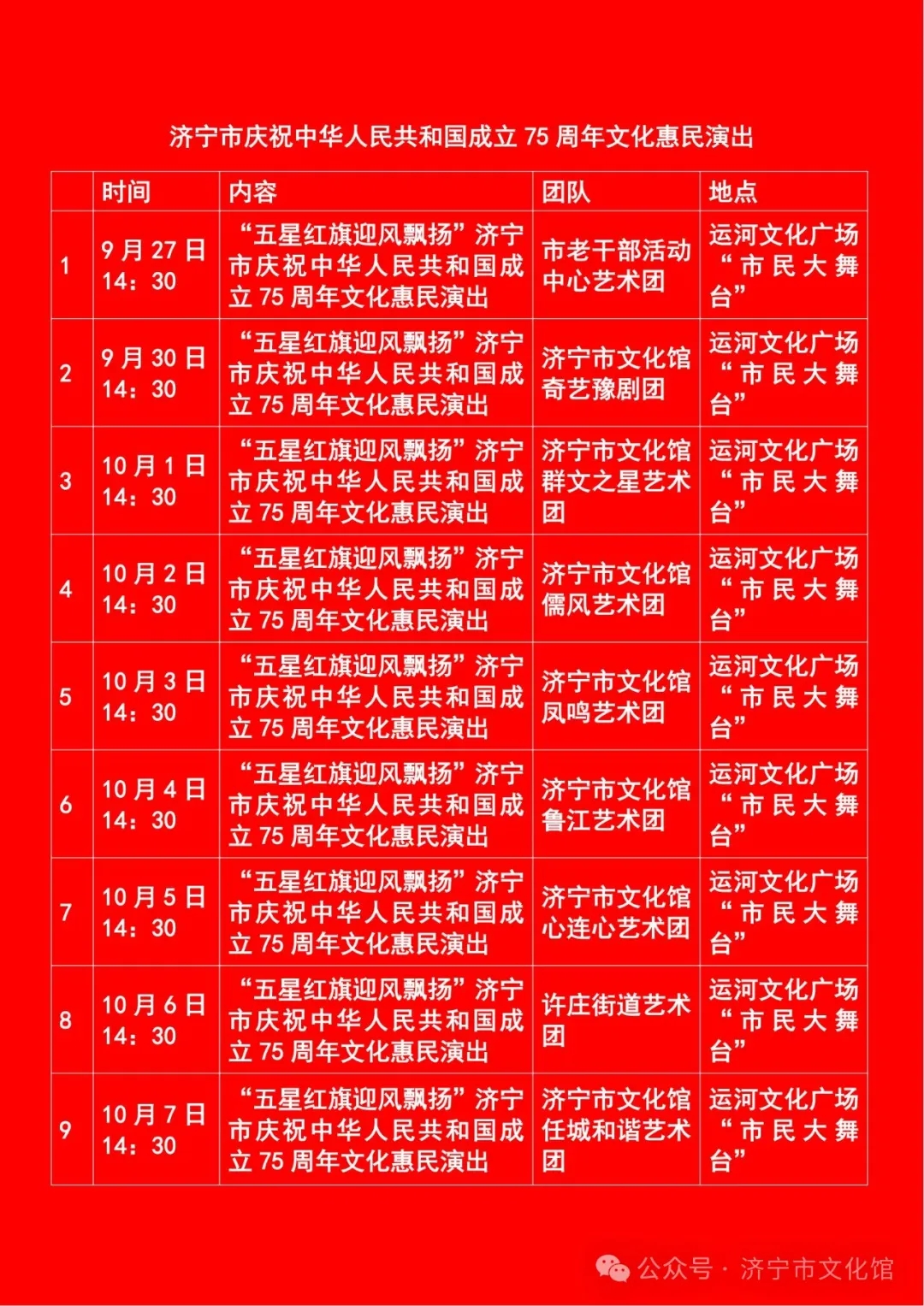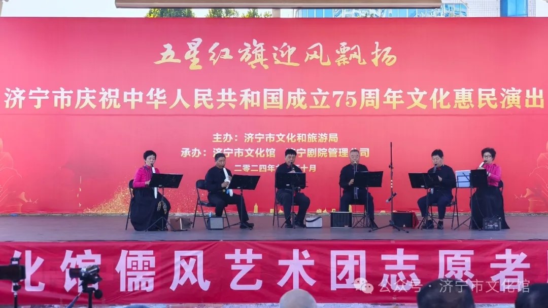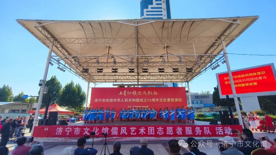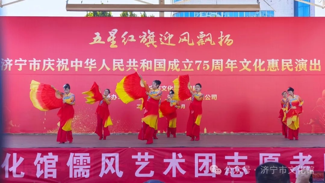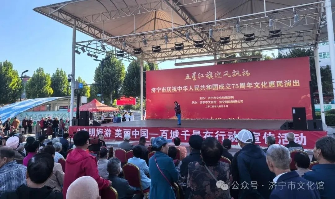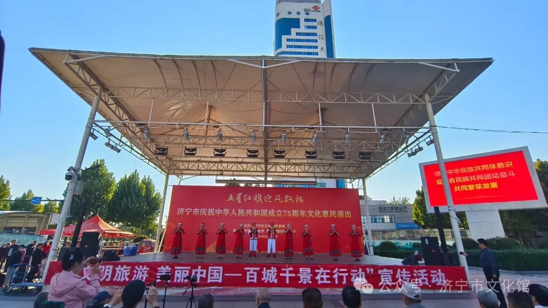 102日,为庆祝中华人民共和国成立75周年,丰富广大群众国庆节假期精神文化生活,由济宁市文化和旅游局主办,济宁市文化馆 济宁剧院管理公司承办的“五星红旗迎风飘扬”文化惠民演出(第三场)在运河文化广场“市民大舞台”成功举办。