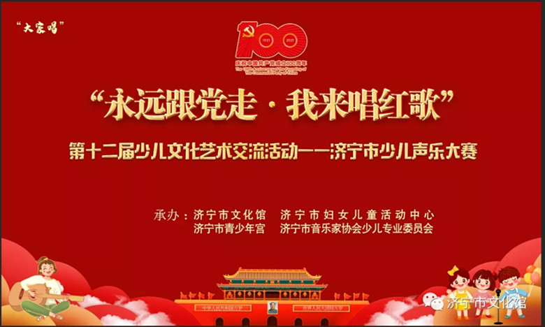 为庆祝中国共产党成立 100 周年,弘扬中华优秀传统文化,引导少年儿童树立正确的世界观、人生观、价值观,培养德智体美劳全面发展的社会主义事业建设者和接班人,落实“山东省文化和旅游厅关于开展2021年度全省‘五个大家’系列活动”,9月14日济宁市庆祝建党 100 周年“永远跟党走·我来唱红歌”第十二届少儿文化艺术交流活动——济宁市少儿声乐大赛复赛、决赛在济宁市文化馆举行。